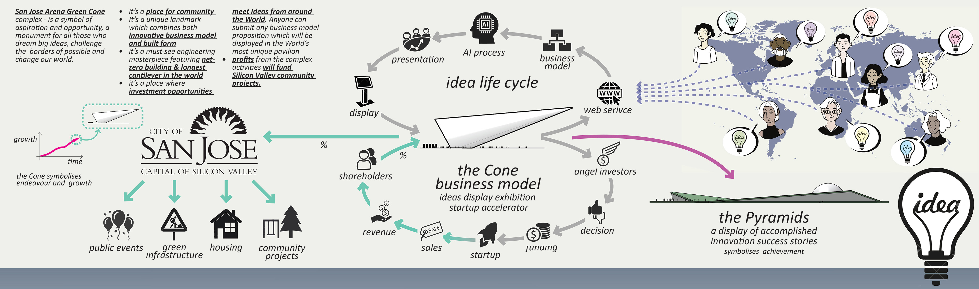 San Jose Arena Green Cone complex - is a symbol of aspiration and opportunity, a monument for all those who dream big ideas, challenge the borders of possible and change our world.