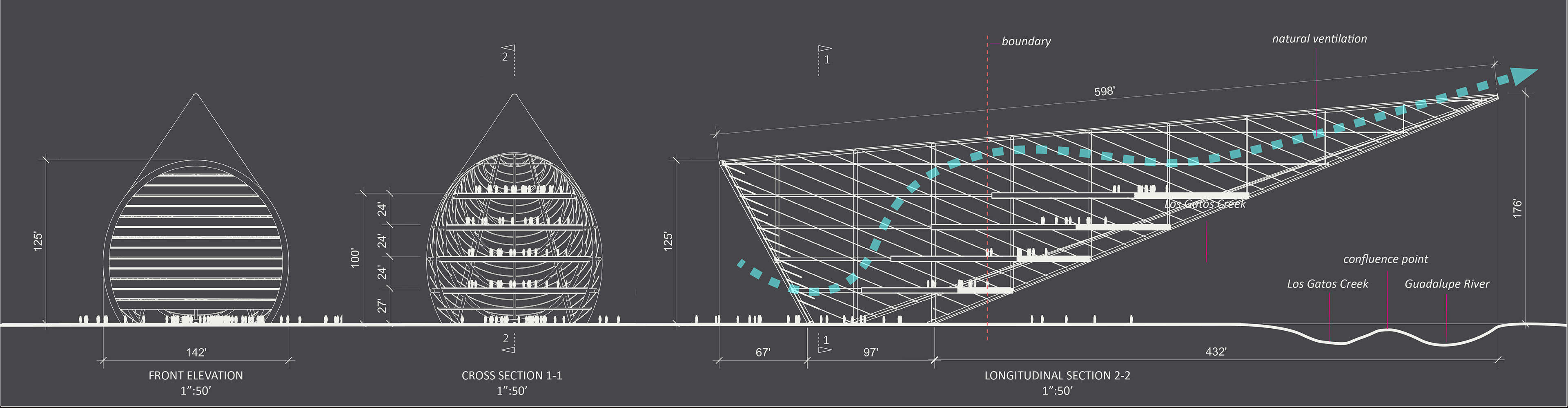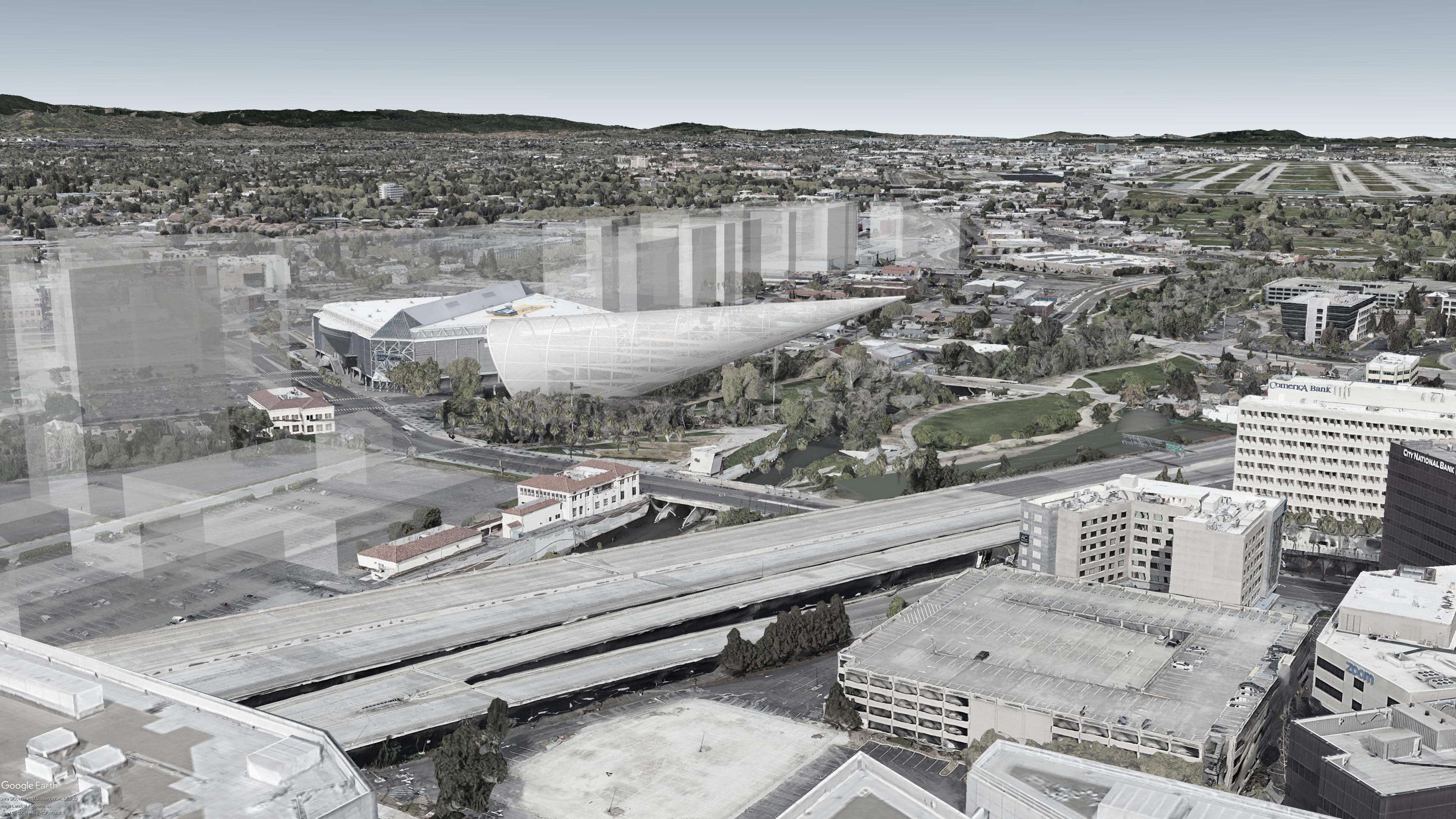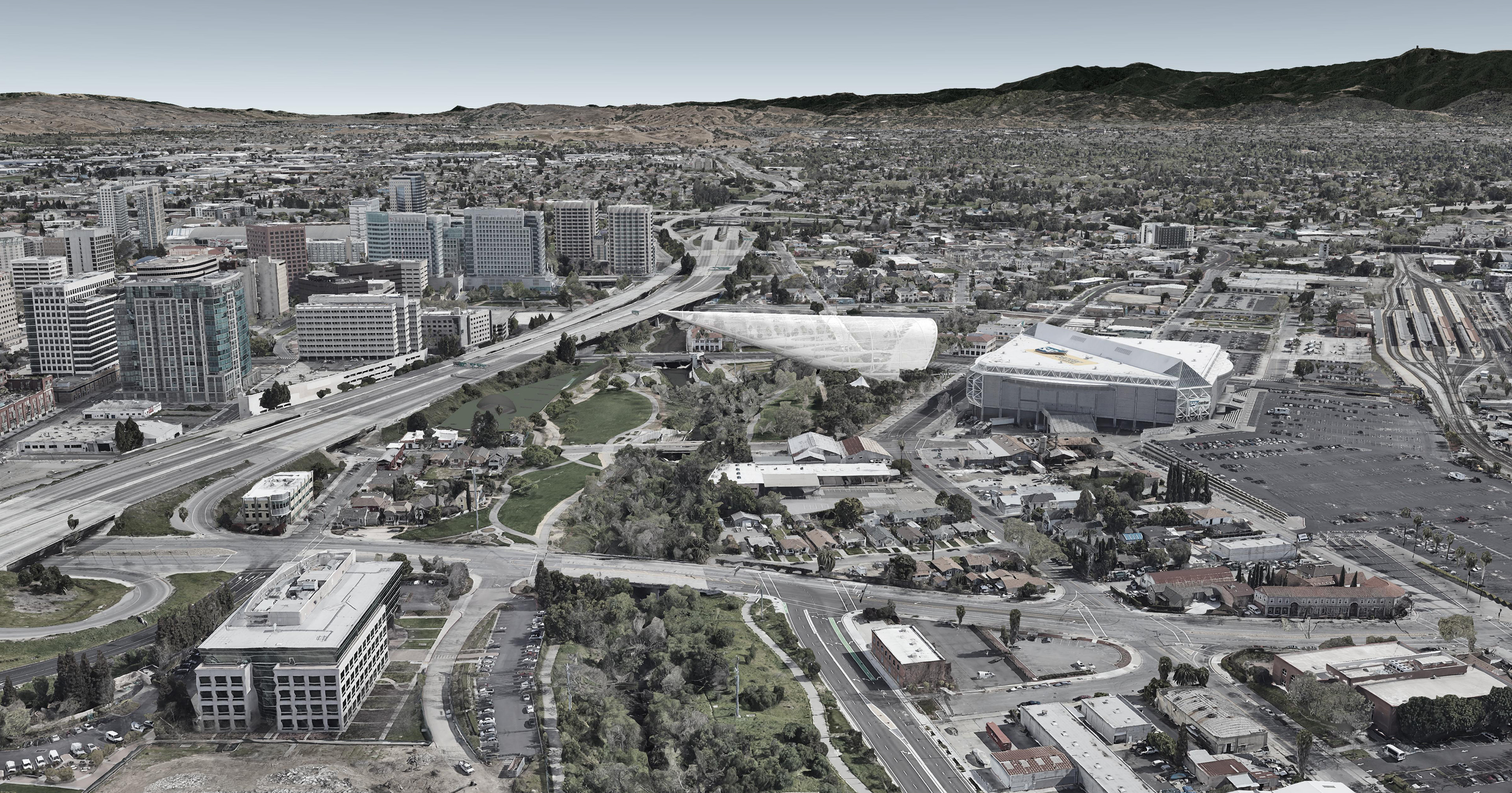 The Cone is a memorable, distinct new landmark on the San Jose skyline: 140ft wide, 600ft long inclined to the horizon with the point elevated approx 180ft above ground. It’s the longest 430ft cantilever in the world hovering above Los Gatos Creek and Guadalupe River confluence point. It will be seen from afar along Highway87 and neighbouring cities.