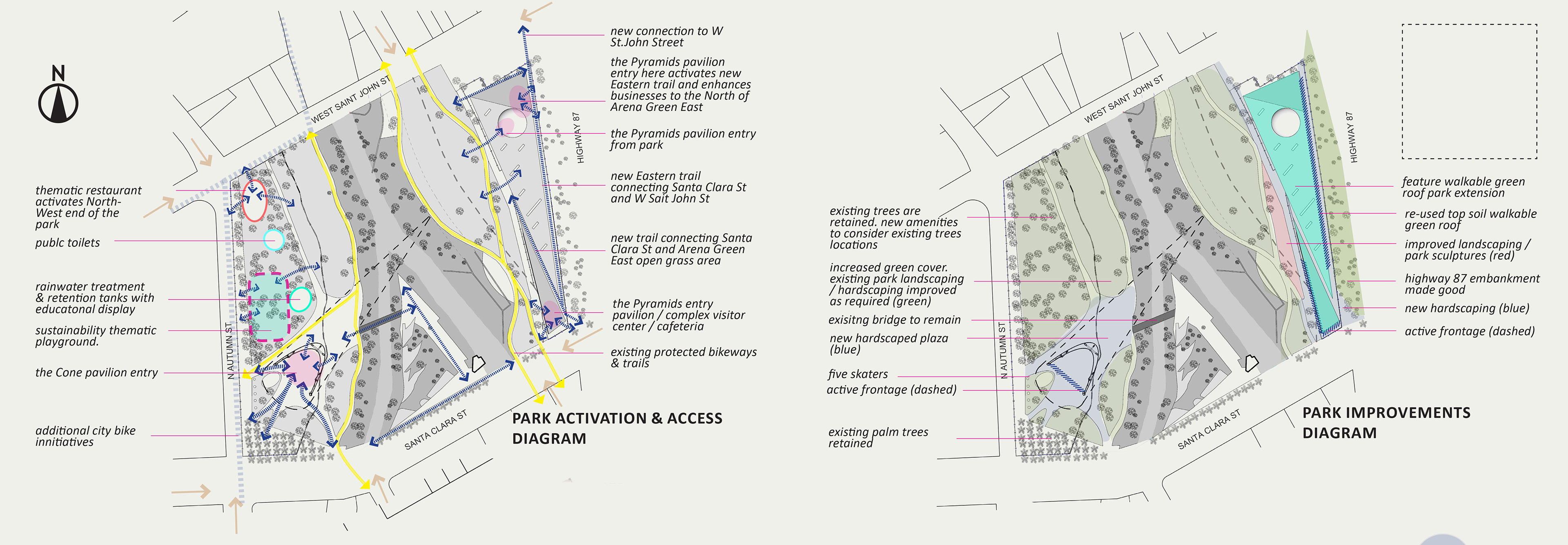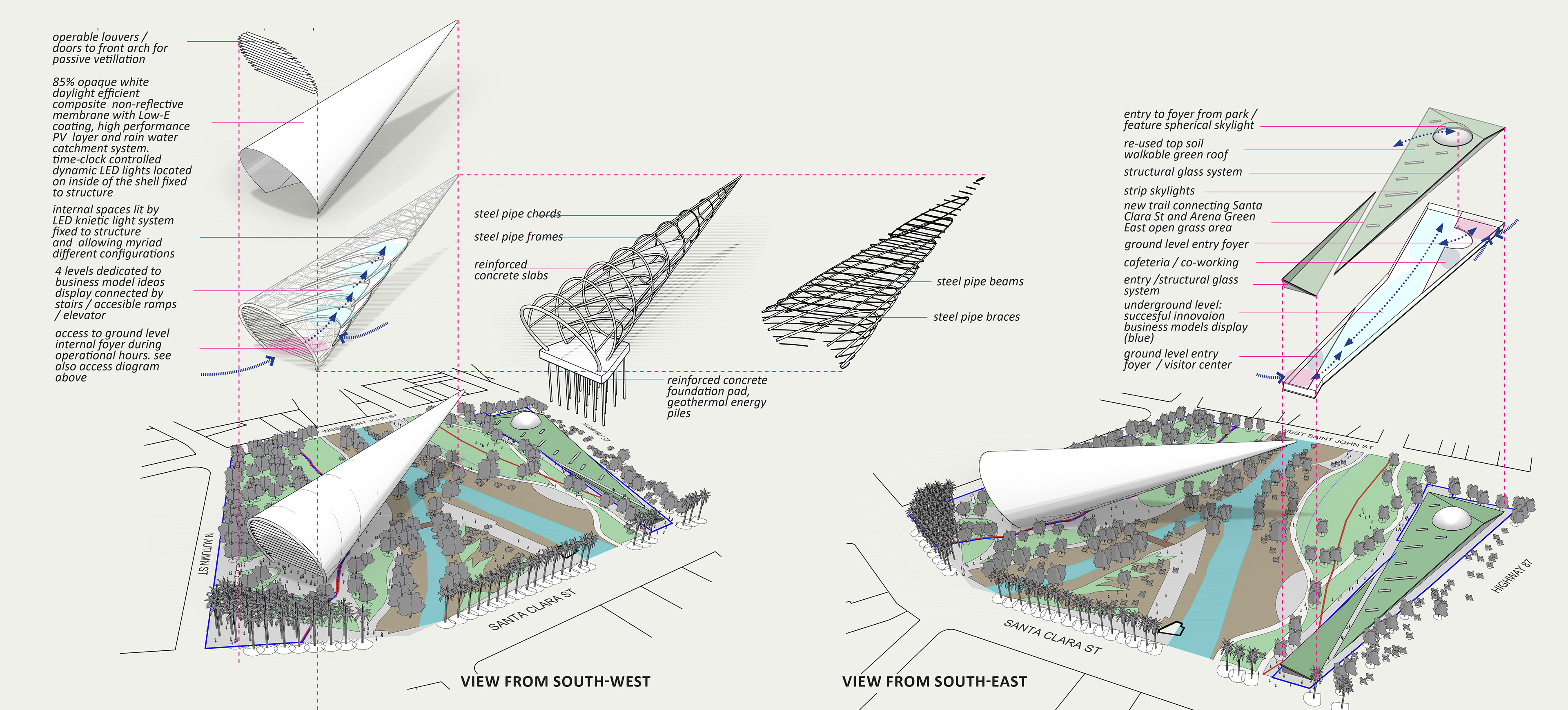 The concept for San Jose Arena Green Cone complex draws on the culture of innovation and global success of Silicon Valley. It’s expressed through: